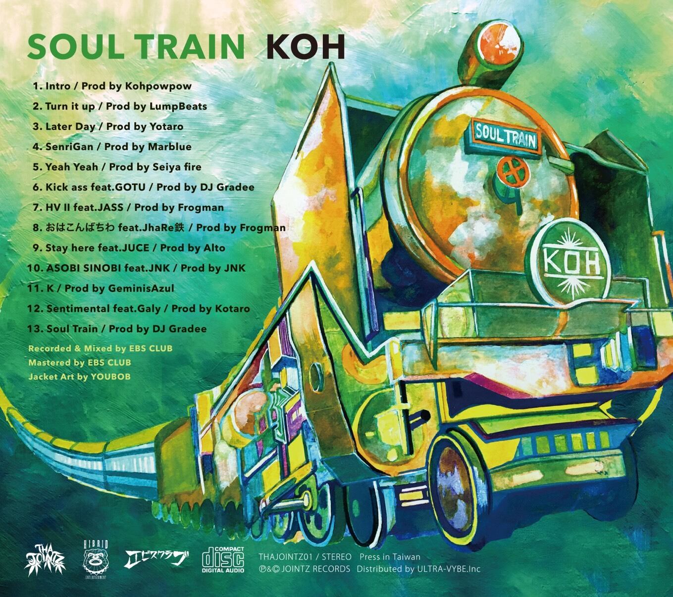 作品説明文:Tha Jointzを代表するKohのソロアルバム。「8割型超いい感じ、あと残りの2割はいい感じ。」とすべてのマイナスをもプラスに変えてしまえという病んだ母国そして自分やジャパニーズHiphopに対して綴った全13曲。トレンドに流され過ぎて自分を見失ってる世の中の奴らに大阪アメ村から送る1st Album「Soul Train」要Check!!!